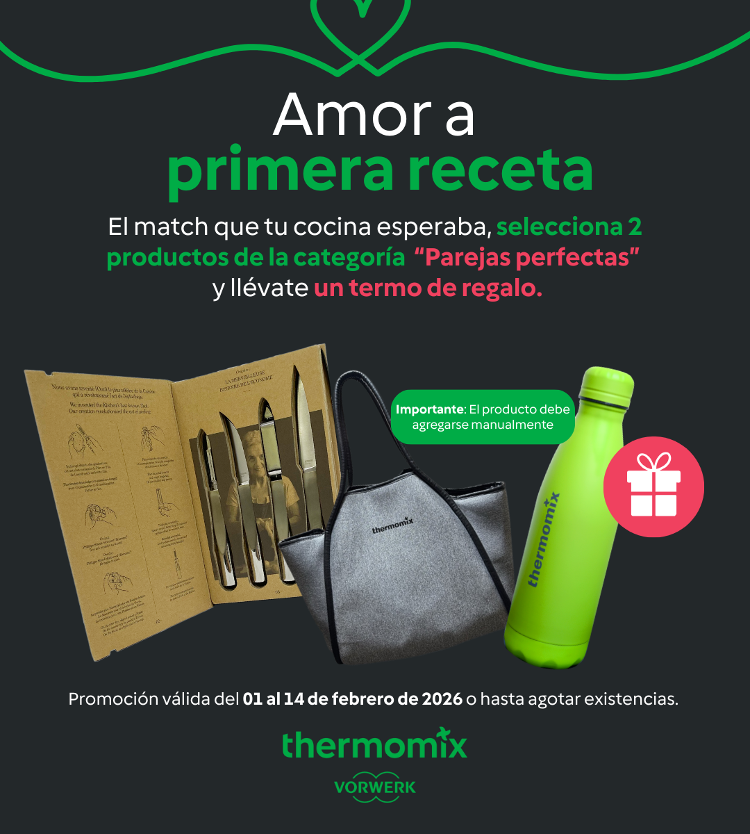 Elige 2 productos de la esta categoría “Parejas Perfectas”, agrega el termo verde de forma manual y al finalizar tu compra se aplicará el descuento para que te lo lleves